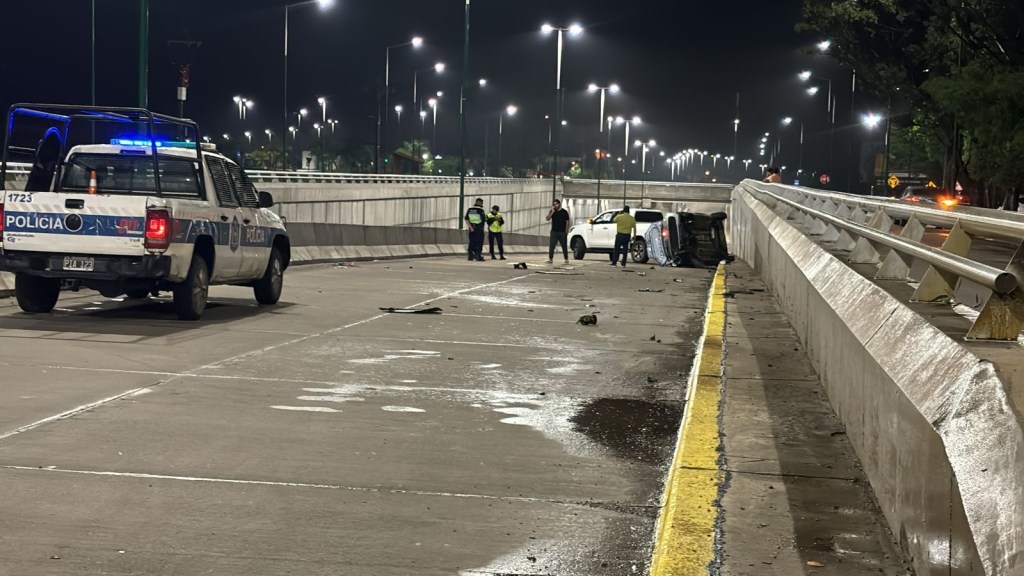 Pasada la medianoche, un automóvil, conducido por una joven, terminó volcando luego de chocar contra un borde del puente ubicado sobre Avda. Perón, frente al Colegio San Pablo, en la zona oeste de la ciudad de Salta.