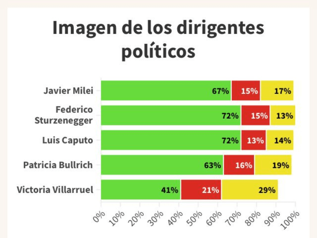 No obstante, en cuarto lugar se encuentra la actual ministra de Seguridad, Patricia Bullrich, quien ostenta un 63% de imagen positiva. En tanto, en la quinta posición se ubica la vicepresidenta Victoria Villarruel, con 41% de imagen positiva.