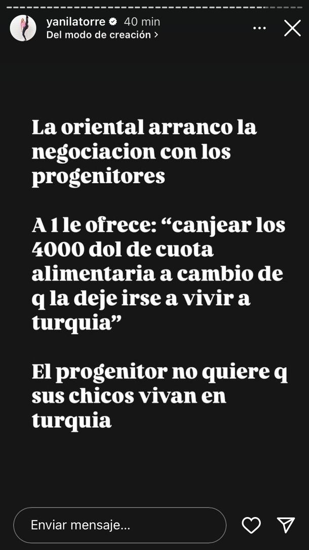 «La oriental arrancó la negociación con los progenitores. A uno le ofrece canjear los 4.000 dólares de cuota alimentaria a cambio de que la deje irse a vivir a Turquía», detalló la mediática, aunque especificó que «el progenitor no quiere que sus chicos vivan en Turquía», dejando en claro que se trata de Benjamín Vicuña, dado que es con el único que ha tenido más de un hijo.