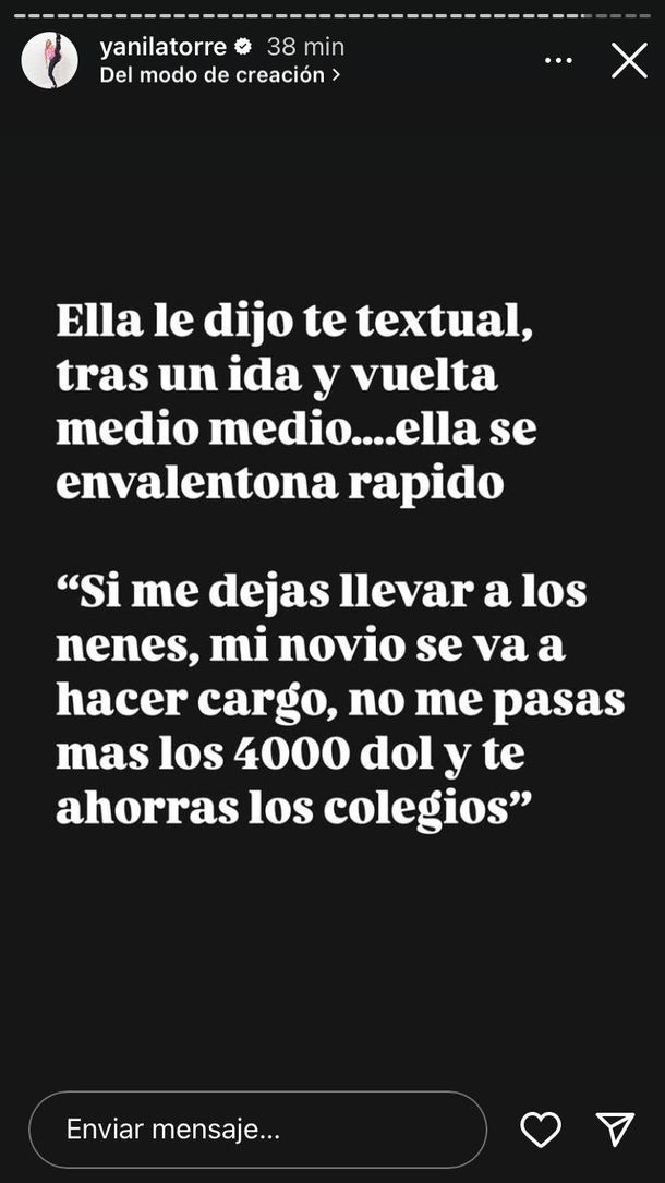 En este sentido, Latorre indicó: «Ella le dijo re textual, tras un ida y vuelta medio medio… ella se envalentona rápido. Si me dejás llevar a los nenes, mi novio se va a hacer cargo, no me pasás más los 4.000 dólares y te ahorrás los colegios«, habrían sido las frías palabras de la China Suárez a Vicuña.