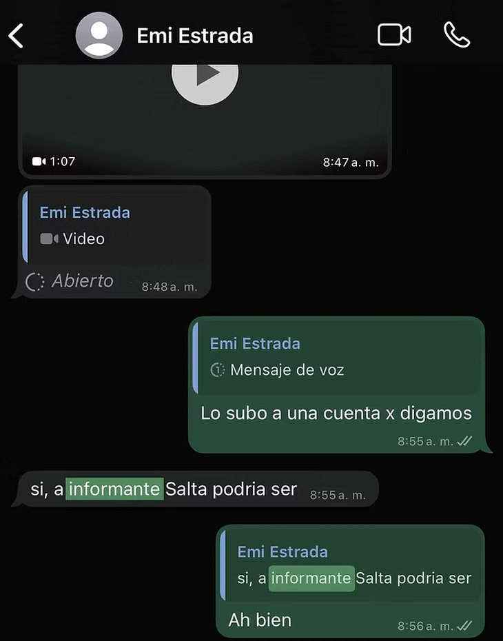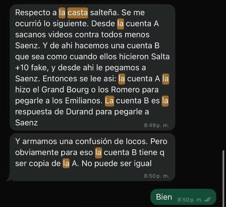 Entre los detalles revelados en los chats, se menciona que Estrada establecía los horarios de publicación, revisaba cada pieza antes de su difusión y determinaba el tono de los mensajes para hacerlos más creíbles. Incluso ordenó la creación de cuentas falsas que imitaban medios de comunicación reconocidos, como el caso de “Informante Salta”, con una estética similar a la de InformateSalta, para darle mayor alcance y legitimidad a las publicaciones.