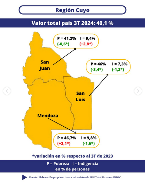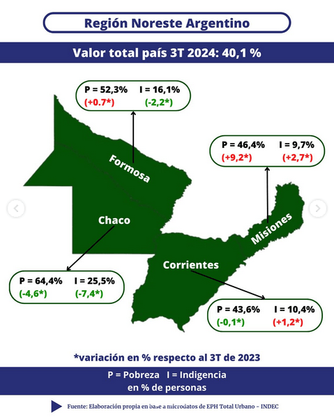 En consonancia con los resultados arrojados por la EPH para 31 aglomerados urbanos del 3T 2024, se evidencian niveles de pobreza e indigencia a nivel nacional equivalentes a un año atrás. Eso no significa que todas las provincias hayan experimentado la misma tendencia