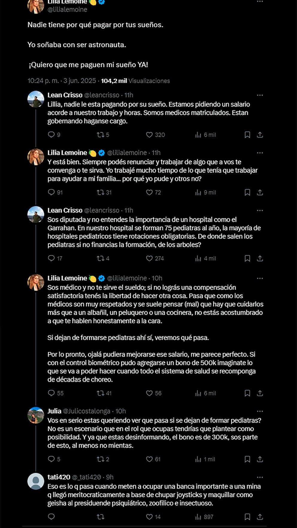El mensaje, publicado en su cuenta personal de X (antes Twitter), estaba dirigido a los médicos residentes del Hospital Garrahan, que desde hace semanas reclaman mejoras salariales frente a un contexto de alta exigencia profesional y creciente inflación. La funcionaria ironizó sobre la vocación médica al compararla con una fantasía personal: “Yo soñaba con ser astronauta. ¡Quiero que me paguen mi sueño ya!”, escribió.