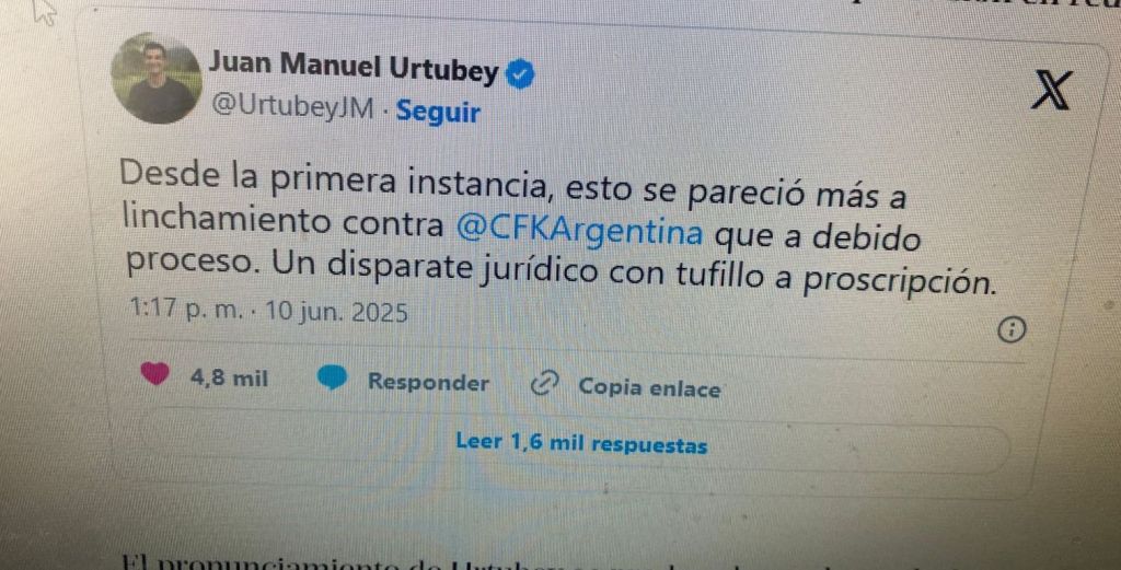 Cabe recordar que el ex mandatario, apenas anoticiado de la condena, a través de sus redes sociales, sostuvo que: “Desde la primera instancia, esto se pareció más a linchamiento contra @CFKArgentina que a debido proceso. Un disparate jurídico con tufillo a proscripción”, escribió el exmandatario provincial, en un mensaje que generó amplia repercusión en redes sociales.