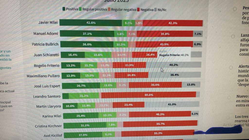 En este sentido, analizó varios aspectos y se llegó a distintas conclusiones relacionadas con la coyuntura. Entre los principales puntos, se indagó en la imagen positiva de los principales dirigentes, y el resultado fue contundente: el que actualmente conserva el primer puesto es Milei (con 42,6% de imagen positiva y un 9% de «regular positiva»).