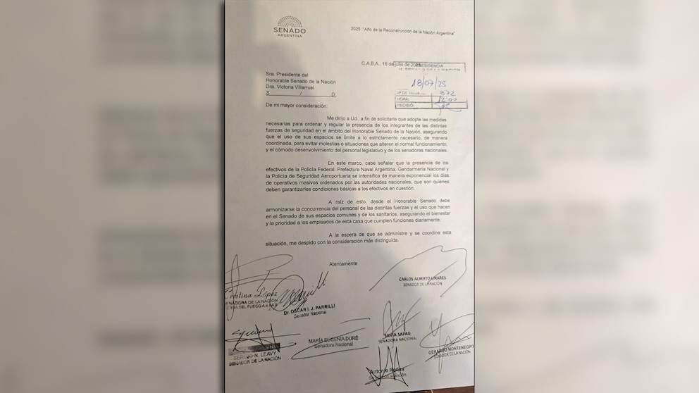 La misiva, firmada por Oscar Parrilli, Silvia Sapag, Antonio Rodas, Cristina López, Sergio Leavy, Carlos Linares, María Eugenia Duré y Gerardo Montenegro, entre otros legisladores, exige a la vicepresidenta que no permita que policías y gendarmes que trabajan en la custodia del Congreso puedan utilizar los baños del Senado.