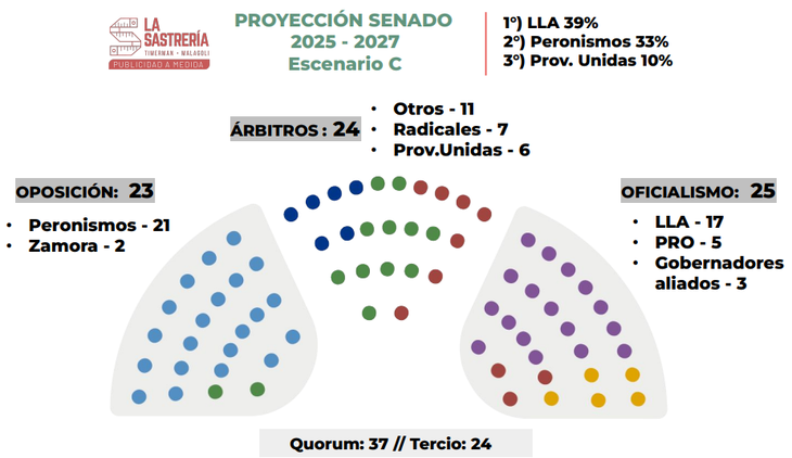 Siempre de acuerdo al mismo estudio de La Sastrería, el PRO y los gobernadores cercanos (si se toma el escenario más benévolo para el oficialismo) reunirían 24 y 8 bancas, respectivamente. Es decir, sobraría para reunir el tercio, pero aún el oficialismo debería seguir negociando con espacios como Provincias Unidas o la UCR para lograr el número mágico de 129.