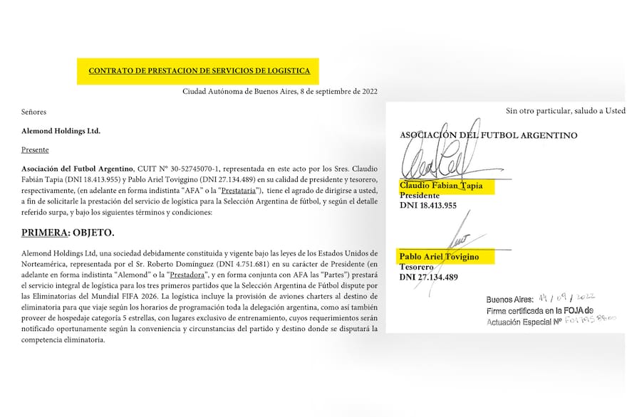 El convenio fue firmado en septiembre de 2022, cuando faltaban apenas tres meses para el debut del equipo de Lionel Scaloni en Qatar. Claudio “Chiqui” Tapia y el tesorero Pablo Toviggino estamparon sus firmas en representación de la AFA, mientras que del otro lado apareció Alemond Holdings Ltd, una sociedad constituida en Estados Unidos.