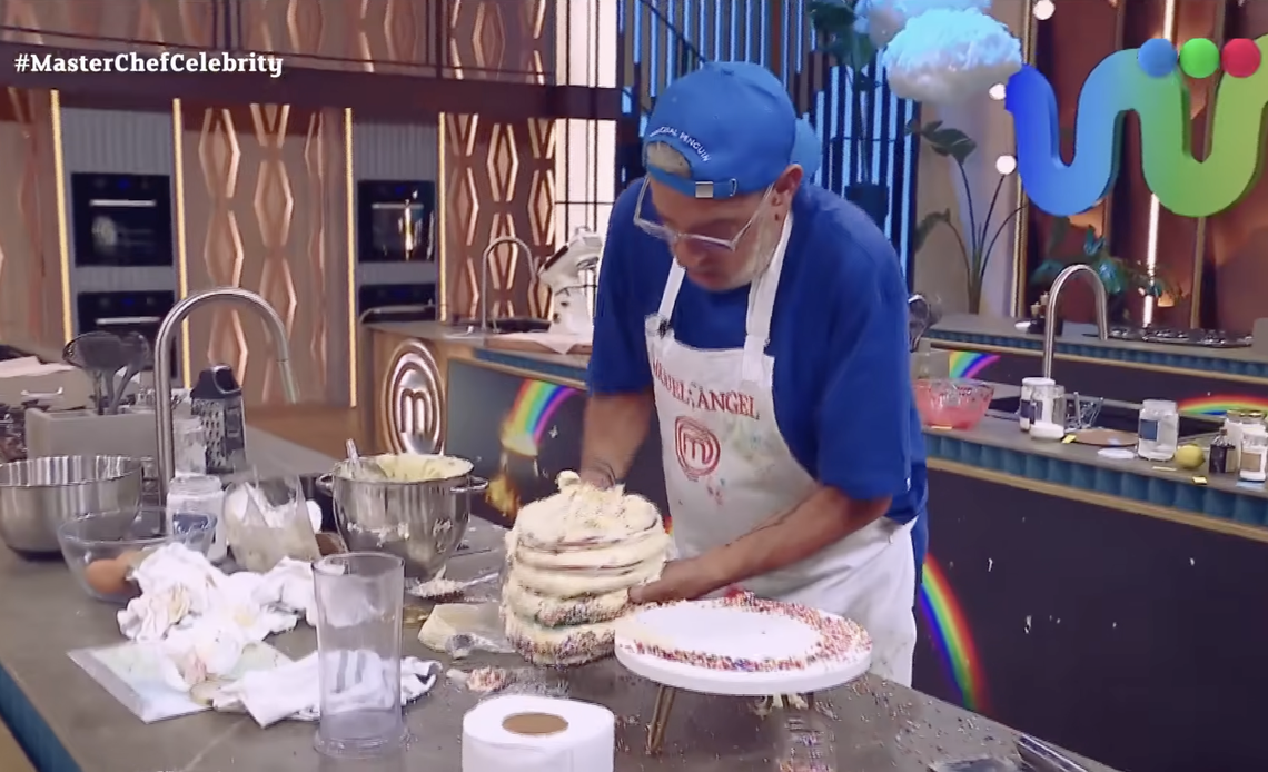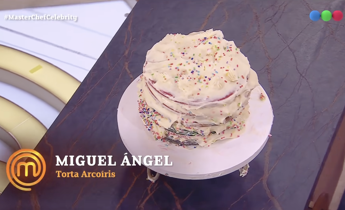 Rodriguez decidió terminar su torta con la poca crema que le quedaba en la manga pero, todavía faltaba lo peor porque los 6 pisos de la torta arcoíris que le exigió el pastelereo Damián Betular se derrumbaron sobre la mesada.