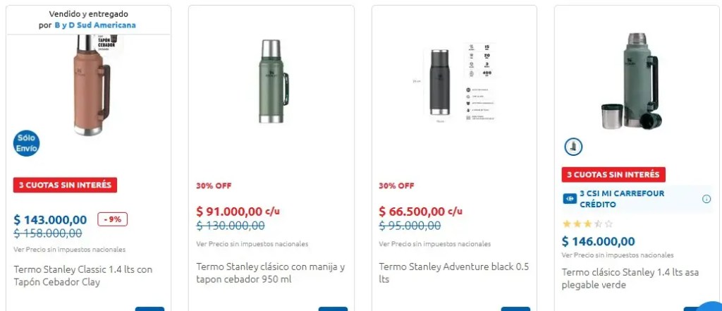 Desde hace unos meses, la cadena de supermercados Carrefour comenzó a vender en sus sucursales y en la página web los productos Stanley, tanto termos como botellas y mates, algunos de los artículos preferidos por los argentinos que viajan al exterior.