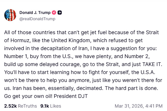 “A todos esos países que no pueden conseguir combustible para los aviones debido al bloqueo de Irán en el Estrecho de Ormuz, como Reino Unido, que se negó a participar en la decapitación de Irán, les tengo una sugerencia. Primero, compren a Estados Unidos, tenemos de sobra. Y segundo, ármense de valor, vayan al estrecho y ¡tómenlo! Tendrán que aprender a luchas por sí mismos. EE.UU., ya no estará ahí para ayudarlos, igual que ustedes no estuvieron para nosotros. Irán fue, esencialmente, diezmado. Lo más difícil ya pasó. ¡Vayan a buscar su propio petróleo!, lanzó el magnate republicano, en una dura invectiva.