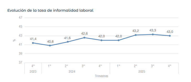 En medio de una alta precarización laboral, la informalidad laboral alcanzó el 43% en el cuarto trimestre de 2025 desde el 42% del mismo período del año previo, según informó el Instituto Nacional de Estadística y Censos (INDEC). Esto implica que 5,8 millones de argentinos, de los 31 aglomerados urbanos, no poseen obra social ni descuento jubilatorio. La tasa más alta se observa entre las mujeres de hasta 29 años, donde el indicador alcanza el 57,9%; y las de 65 años y más, que tienen un índice de 61,6%.